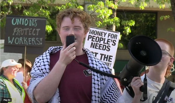 Ben Mannix: Hi, everyone. I’m Ben. I’m a physics Ph.D. student at UO and a proud member of the Graduate Teaching Fellows Federation, GTFF. We’re here today on May 1, International Workers’ Day, May Day, and also known as Labor Day everywhere else in the world, to gather and celebrate our value and power as workers in our community.