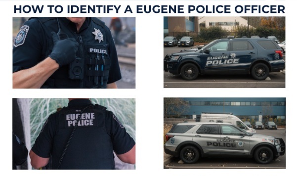 Federal agents may wear uniforms with the word POLICE on them, which may cause confusion about Eugene Police officers being involved in immigration enforcement actions happening in our community. Here are some tips on how to identify our officers: