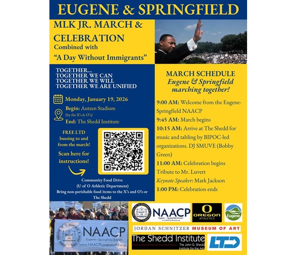 Jana Thrift Yeah, food security, such important stuff. Yeah. Thank you for all that good work you’re doing in so many different ways, Eric, sharing about what’s going on with the upcoming MLK March that will begin at 9 a.m. next to the X’s and O’s by Autzen Stadium there on MLK Parkway, and then it will march over to the Shedd Institute, where they’ll have a whole program of fabulous MLK celebratory stuff.