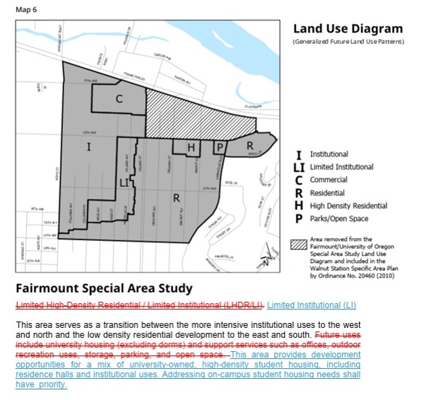 Without invoking that process, the U of O has now unilaterally proposed major changes to the refinement plan that undermine the plan’s agreed policies and goals, and threatens the livability of the neighborhood—to me, clear violations of Eugene Code 9.8424 and 9.8065.