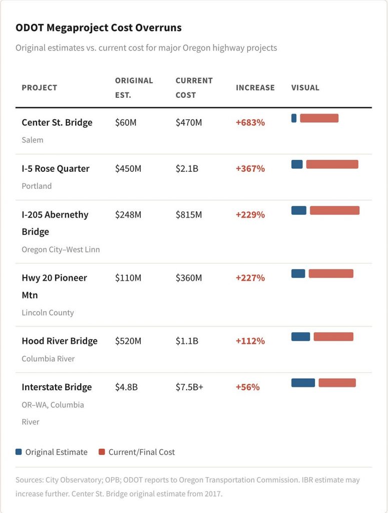 ODOT recently shifted $100 million in bridge maintenance funds just to cover overruns on the Abernethy Bridge—money that could have gone to the maintenance and operations the agency says it can’t afford. The agency has consistently prioritized starting megaprojects over finishing them, then used the resulting deficits to justify requests for more revenue.
