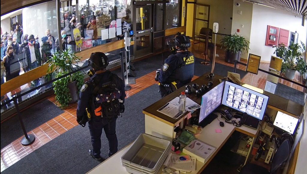 And then when the backup showed up, which was probably an hour after, it seemed like a good hour after those first two flash-bangs happened, and I assume that that is when the window got broken because that’s when the police showed up, that’s when they declared it a riot.