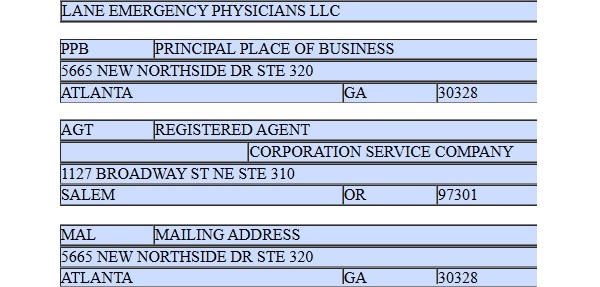 There is nothing local about Lane Emergency Physicians. The Atlanta "manager-managed" LLC places control with designated managers rather than physician members, precisely the arrangement Oregon’s SB 951 was designed to scrutinize.