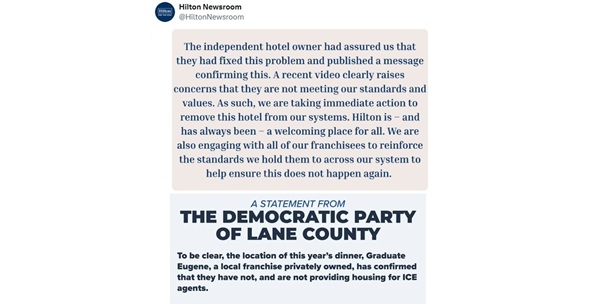 Presenter: Hilton is silent on whether it will sever ties with the Eugene Graduate, after local Democrats taunted the Trump administration by stating that the hotel’s local owners “are not providing housing for ICE agents.”